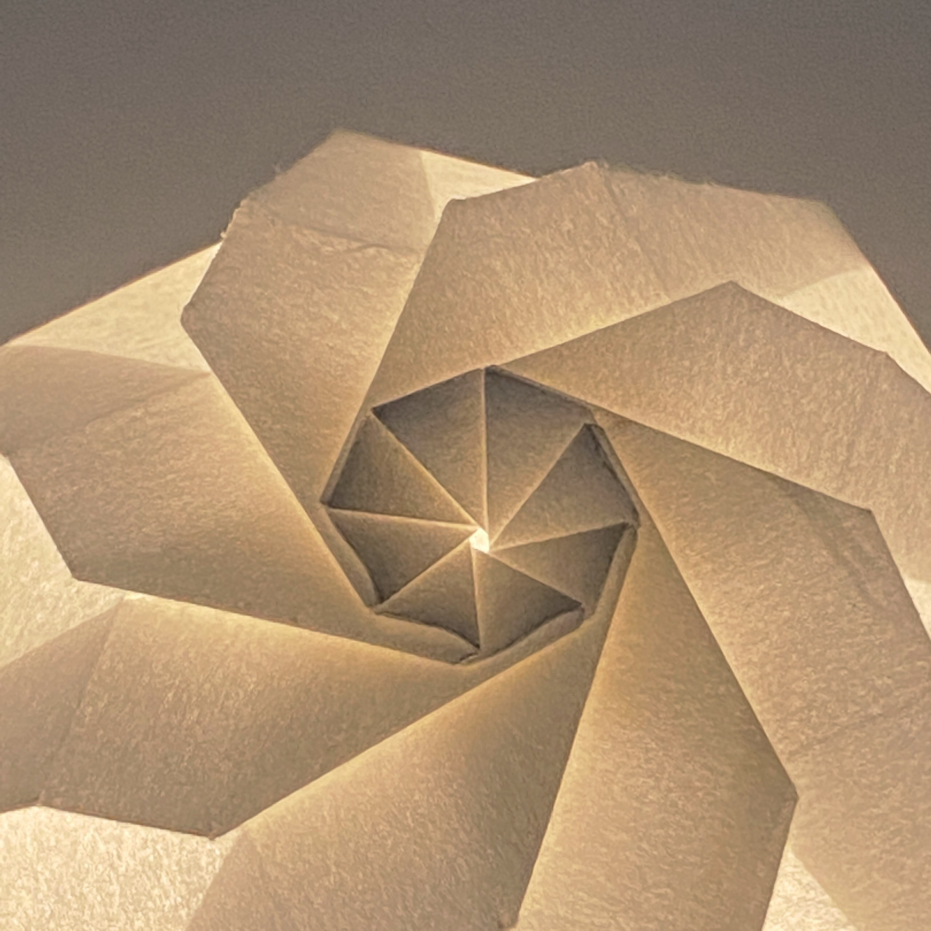 骨格となる木などのフレームが無く、和紙加工紙を手で折ることで立体化させ、伝統の和紙と近代の技術を融合させた、今迄にない新しいタイプの照明器具です。